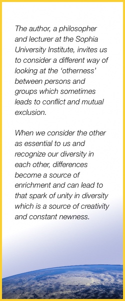 Proceeding from what has been said, the conflict between me and the other, on closer inspection, arises as soon as I do not pay attention to this dynamic where the other is essential to me. And, precisely, either I or the other think of ourselves as mutually exclusive, we believe ourselves to be “one”, in unity first of all with ourselves, without the others. If this is true, identity and unity, whether they be personal or those of a group, are not such regardless of the other. Therefore, when we place ourselves in an exclusionary, conflictual way, not only do we try to deny the difference of the other, because in some way somehow we find it difficult to accept it, but more profoundly, since I am not even me if I do not carry the other in me, we are unconsciously trying to deny ourselves as well.